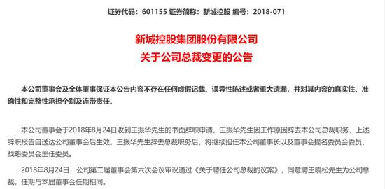 2018年8月24日晚,新城控股集团发布了公司总裁变更的公告。公司总裁王振华因工作原因辞职,公司聘王晓松为公司总裁,任期与本届董事会任期相同。王振华辞职后,将继续担任公司董事长及董事会提名委员会委员、战略委员会主任委员。