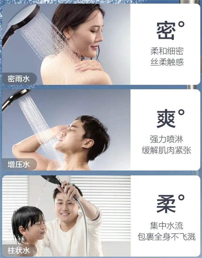 这款花洒还有一个核心亮点,就是它的畅霖 ® 增压技术,搭配增压花洒的加持,能释放出双倍水量的澎湃水流,带来远超普通花洒的冲淋快感,更能打造出密雨水、增压水、柱状水三大场景水型。无论是想要轻柔包裹周身的密雨模式,还是强力冲刷肩颈的增压模式,亦或是精准清洁的柱状模式,都能一键切换,满足不同沐浴需求。